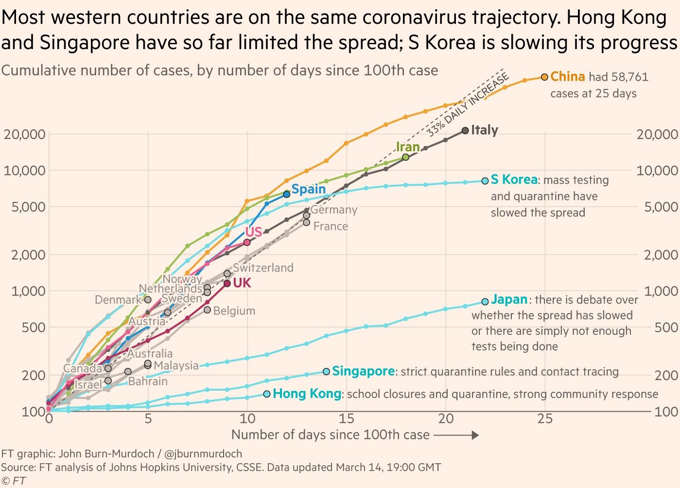 Here's a chart from March 14 showing how things are progressing by country - it's pretty uneven, which suggests that how we respond matters (and arguably social distancing works).