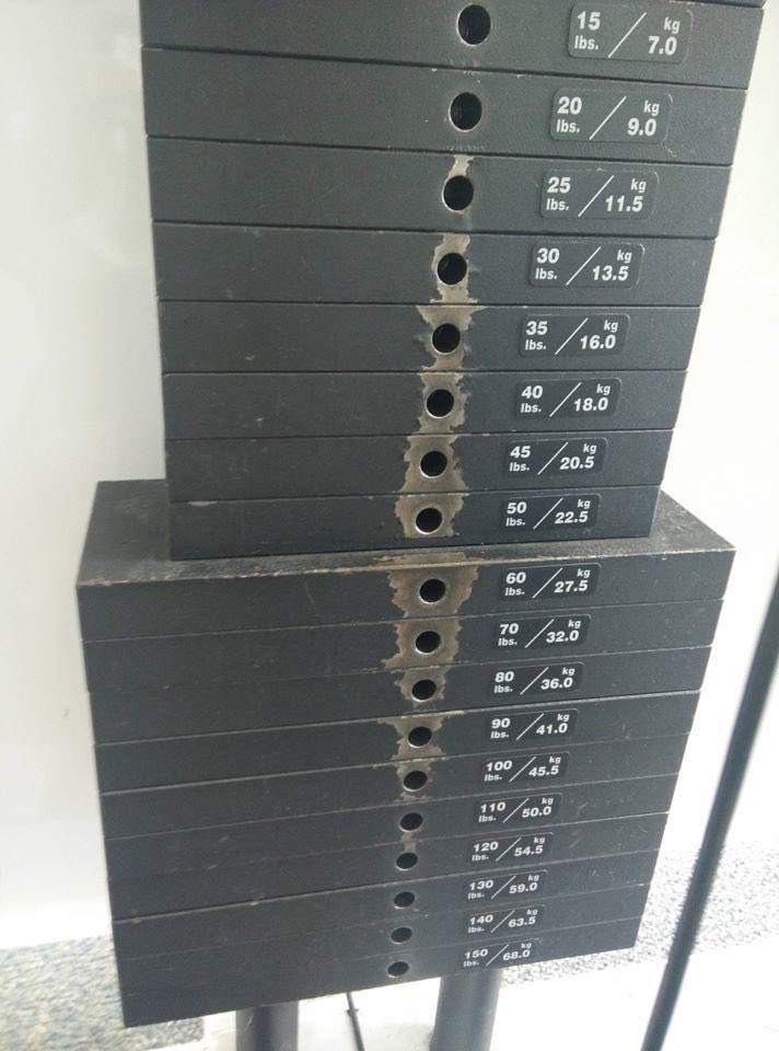 Those weight stacks are used in various machines tailored for different exercises, and come with 2.5, 5, 7.5, etc. pound (detached) weights that fit around the cable on top of the lightest plate, to enable smaller weight increments.