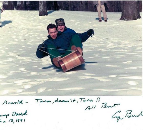 Note: some people argue this is a staged photo, but other sources tell us in Schwarzenegger's auto-biography "Total Recall" that they really were sledding that day and ran into Barbara Bush and broke her leg, which arguably explains the note on the photo from Bush saying "Turn, damn it, Turn!"