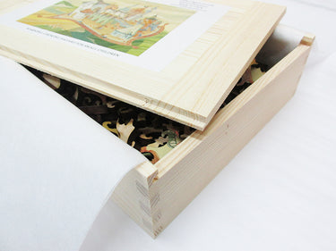 Like all our puzzles, laser-cut from 1/4" thick wood. Packaged in our standard pine wood box. Made in USA.