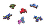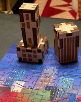 The puzzle design by Jef Bambas has a regular measure of right-angled pieces with knob connectors, and licks of jazzy whimsies. This puzzle is average hard, EXCEPT there are some extra pieces that will build a couple 3D skyscrapers (see product photos), you can figure those out yourself or use these photo instructions.