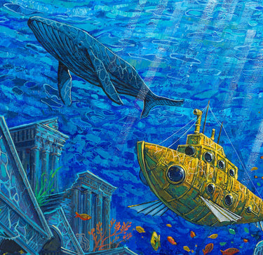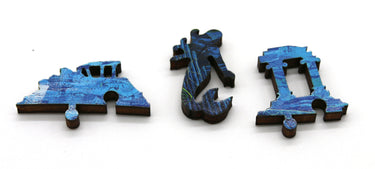 This is a 299 piece wooden jigsaw puzzle of the aquatic "Atlantyda" by Roch Urbaniak. The undersea ruins of the art are matched with a civilized puzzle design architected by Jef Bambas.