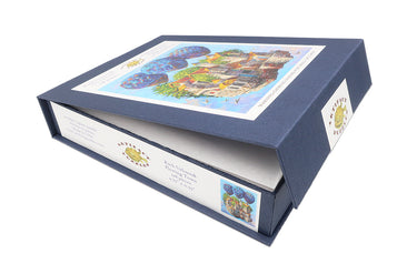 This is an uplifting 228 piece wooden jigsaw puzzle of "Floating Town" by Polish painter Roch Urbaniak.