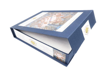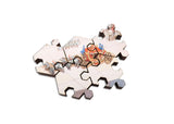 The puzzle design by Jef Bambas uses hexagonal pieces with identical hexagonal connectors, and very few whimsies, requiring careful perusal of the highly-detailed image - this is a really hard puzzle!