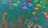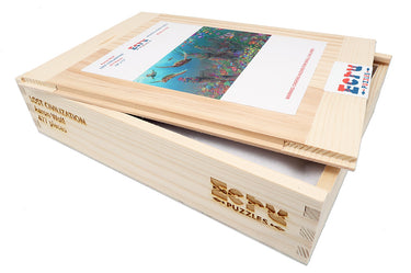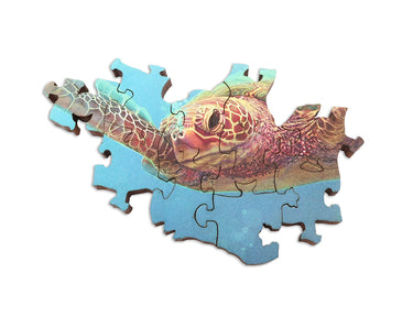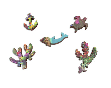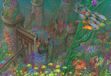 Take a deep dive into this 447 piece wooden jigsaw puzzle of "Lost Civilization" by Aaron Wolf, a picture of a delightful underwater kingdom.