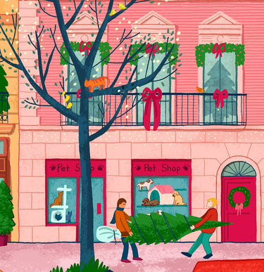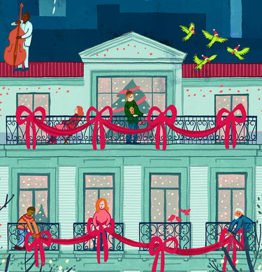 We commissioned this artwork from Spanish artist and architect Elisa Lara Campos in 2024. The city is mostly based on Adelaide (Australia), with touches that will remind you of Manhattan, Paris, Amsterdam, and Madrid. The artwork is mostly realistic, with just a few fanciful holiday details like Santa Claus and his reindeer.