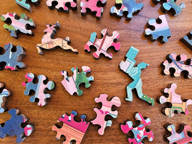 The puzzle's diffcultly level is average, with a straight edge, holiday & city themed whimsy pieces, and curvy irregular piece shapes. Puzzle design by Matt Lyon.