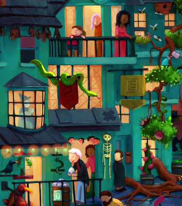 This is a 433 piece wooden jigsaw puzzle of Magic Alley, a detailed scene of wizards and magical shops and exotic pets.
