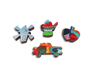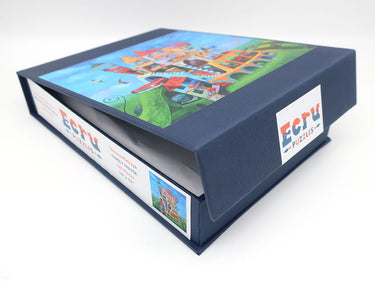 This is a 185 piece Ecru wooden jigsaw puzzle of Tomasz Pietrzyk's "Family House". Our Ecru Puzzles line has matte images that are easier on the eyes. The puzzle design by Jef Bambas uses quirky curves and an irregular edge. NOTE: The irregular edge is not shown in the image on the box! Despite there being no straight edge pieces, this is one of our easier puzzles. The whimsies are playful much like the colorful art. This is a great puzzle to do as a family, and fun to do a few times over. Like all our puzzles, made of 1/4" thick laser-cut wood and made in the USA. Packaged in a blue box with a magnetic clasp.