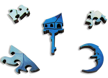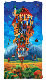 This colorful 629 piece wooden jigsaw puzzle features a 2015 painting by Polish painter Tomasz Pietrzyk of a tall fantastical tower on stilts, and is full of colorful cubist charm.