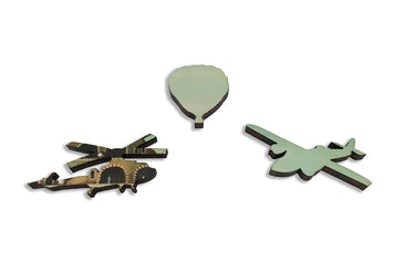 This 300 piece wooden jigsaw puzzle features the neosurrealist painting of contemporary Russian painter Sergey Tyukanov. The puzzle pieces were designed by Seattle artist Maria Berg and includes numerous realistic aviation-themed whimsies.