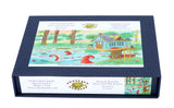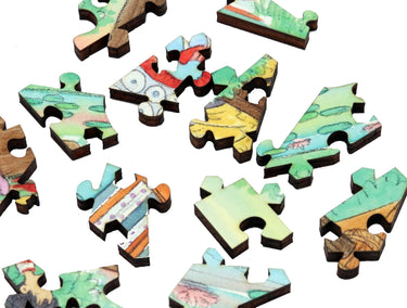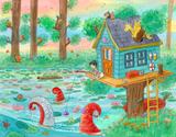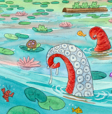This 220 piece wooden jigsaw puzzle has a charming painting by Amariah Rauscher showing a boy fishing in a pond where a kraken lives, as cute colorful birds and a small dragon watch.