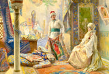 This is a 269 piece wooden jigsaw puzzle of "Rug Merchant" by Italian painter Amedeo Simonetti.