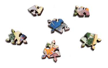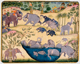 This is a 170 piece puzzle of a 17th century Indian Mughal miniature showing a royal party capturing elephants (see alternate picture for details). The puzzle design by Tara Flannery and Jim Muller has a Cairo-pentagonal grid of pieces with a smattering of elephanty whimsies. The puzzle is extra hard because the connectors are not unique - you have to pay attention to the rich image detail to put it together correctly. This puzzle has a straight edge. Like all our puzzles, laser-cut from 1/4" thick wood. Packaged in a small box with magnetic clasp. Made in USA.