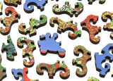 A decorative irregular edge arises naturally from the piece shapes. This puzzle just has a single whimsy to keep it hard, but give that extra spark of joy. NOTE: The irregular edge is not shown in the image on the box!