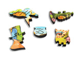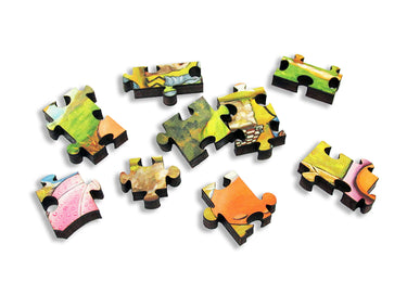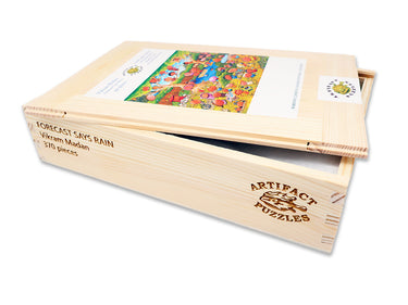This is a 370 piece wooden jigsaw puzzle featuring Vikram Madan's Forecast Says Rain.