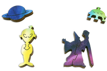 The puzzle is average hard with a lots of cosmic and robot themed whimsies, and a complex, irregular edge, and diverse piece shapes. Puzzle design by David Figueiras.