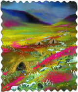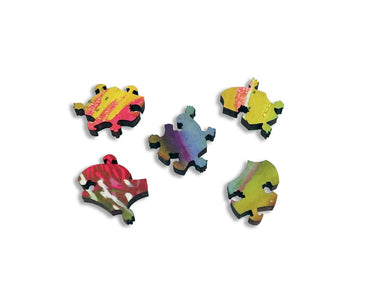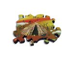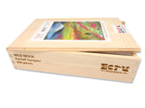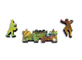 This is a 260 piece Ecru wooden jigsaw puzzle of Rachell Sumpter's "Wild Moor." Our Ecru puzzles has matte images that are easier on the eyes. The colorful landscape in the art is paired with a design by Jef Bambas with clever connectors, a curving irregular edge, and Scottish themed whimsies. NOTE: The irregular edge is not shown in the image on the box! The difficulty of this puzzle is average. Like all our puzzles, made of 1/4" thick laser-cut wood and made in the USA. Packaged in our standard pine wood box.