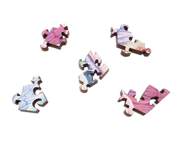 The puzzle has straight edges, many whimsical pieces themed to the image, irregular piece shapes, and a variety of connector shapes. The difficulty is about average for an Artifact puzzle of its size. Puzzle design by Danny Song.