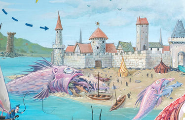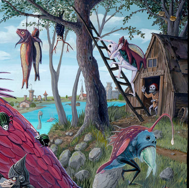 This is a 402 piece wooden jigsaw puzzle of "Big Fish Eat Little Fish" by Joe Vaux, this is a re-creation of Bruegel the Elder's classic engraving, done in color and with Joe Vaux's signature flair (you might recognize Vaux's style from his work on the Family Guy show).