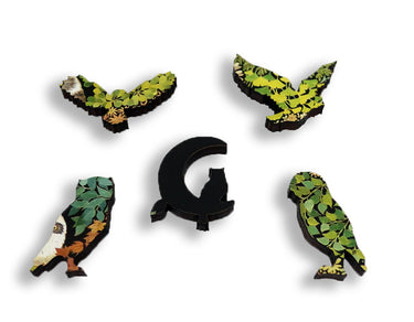 With a whimsical irregular edge, leaf-shaped piece connectors, and over a dozen whimsies - most of which are different varieties of owl - the puzzle is a jam-packed joy to solve. NOTE: The irregular edge is not shown in the image on the box!