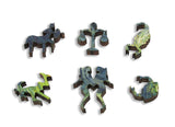 Our 336 piece wooden puzzle of Vincent Van Gogh's Starry Night features zodiac-themed whimsy pieces by Maria Berg. This puzzle has irregular piece shapes, varied connectors, and a straight edge. It's harder than average. All our puzzles are made of 1/4" thick wood. Packaged in an unfinished pine wooden box. Made in USA.