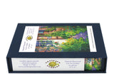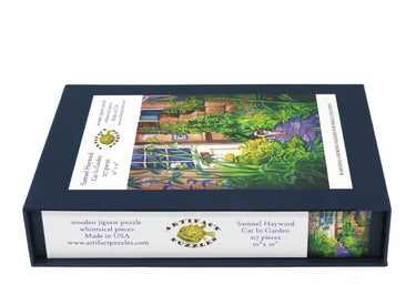 This 217 piece wooden jigsaw puzzle shows a cat enjoying his bright and colorful garden, illustrated by British artist Samuel Hayward.