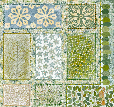 This wooden jigsaw puzzle has 1,001 pieces. Oasis of Tranquility is a highly-detailed botanical image full of flowers and patterns and dots by Australian artist Sandi Rigby.