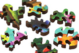 The puzzle has an irregular edge with lots of mushrooms and a very irregular piece shapes with mushroom connectors. Hidden in this forest is a charming set of storybook and deep-dark-forest whimsies! Puzzle design by Matt Lyon.