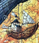 This wooden jigsaw puzzle has 386 pieces and features the painting Key Master by contemporary Polish painter Roch Urbaniak.