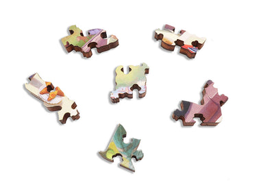 This is a 177 piece puzzle of "The Sunday Paper" by Kathryn Freeman. The artist's pop surrealist take on Seurat's Grande Jatte pairs with David Figueiras's design for a fun puzzle with charming themed whimsies and a wide variety of piece shapes. The puzzle is average difficulty. Like all our puzzles, laser-cut from 1/4" thick wood. Packaged in a blue box with magnetic clasp. Made in USA.