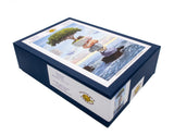 Like all our puzzles, made with 1/4" thick wood and the pieces are laser-cut. Packaged in a 3" tall blue box with telescoping lid, picture on top, and identifying side labels on the long and short side.