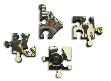 This is a cool 207 piece wooden jigsaw puzzle of Argentinian artist Diego Mazzeo's steampunk digital artwork. Our puzzle pieces are themed to the artwork with steampunk whimsy pieces and an irregular gear-shaped edge (which cuts out much of the white border area). NOTE: The irregular edge is not shown in the image on the box! Puzzle design by Tara Flannery, Ben Goldman and Jim Muller. The puzzle is harder than average. Like all our puzzles, the pieces are laser-cut and are 1/4 inch thick wood. Packaged in a small blue box with a magnetic clasp. Made in USA.
