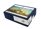 Packaged in a 3" tall blue box with telescoping lid, picture on top, and identifying side labels on the long and short side.