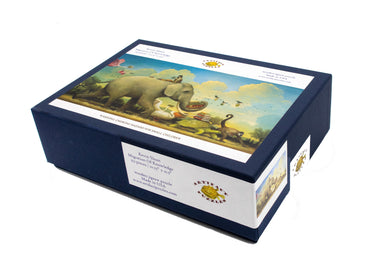 The puzzle design has many extraordinary themed special whimsy pieces woven into a simple grid of square pieces with cheerful knob connectors. Most of the puzzle is quite tight, but there is one loose section where the pieces are in the style of MC Escher. Puzzle design by Tara Flannery.
