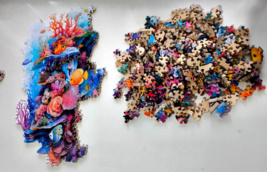 This roughly 600 piece wooden jigsaw puzzle, Deep in the Sea, is hand-cut on a scroll saw from premium birch plywood. Each piece is meticulously crafted by hand (no laser cutting), resulting in a beautiful 3D layered puzzle that is as striking when assembled flat as it is when displayed as décor.
