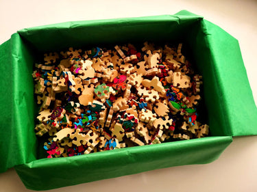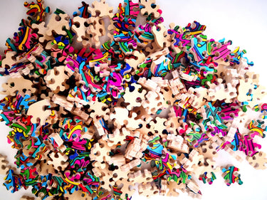 This roughly 250 piece wooden jigsaw puzzle has five layers and is hand-cut from thick 5-ply quarter-inch thick birch wood by Georgi Vasilev of Mr. Gogo Puzzles at his studio in the Rhodope Mountains in Bulgaria.