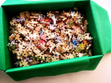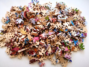 This roughly 375 piece wooden jigsaw puzzle is hand-cut from thick 5-ply quarter-inch thick birch wood by Georgi Vasilev of Mr. Gogo Puzzles at his studio in the Rhodope Mountains in Bulgaria.