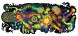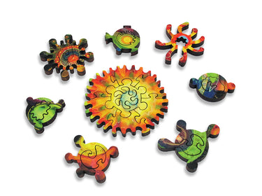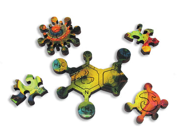 This is a 336 piece wooden jigsaw puzzle featuring Bruce Riley's abstract artwork "Half Life." Puzzle designer Tara Flannery has created a masterful puzzle with its irregular edge, clever themed whimsies, and endless array of different types of connectors. NOTE: The irregular edge is not shown in the image on the box! The puzzle is harder than average.
