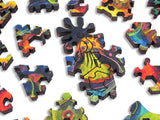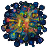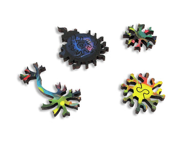 This is a 191 piece wooden jigsaw puzzle of Bruce Riley's painting "Stem Cell". Designed by Tara Flannery, the themed whimsies and miniature hexagonal connectors coupled with psychedelic colors and abstract shapes make for an exciting experience. The puzzle's irregular, microscopic-themed edge adds to the uniqueness and challenge (the difficulty is above average). NOTE: The irregular edge is not shown in the image on the box!