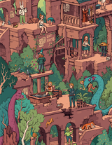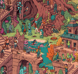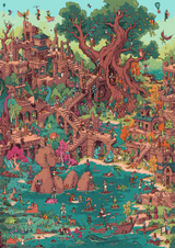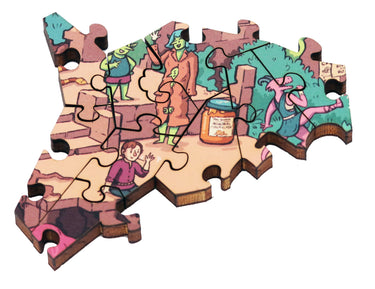 This wooden jigsaw puzzle has 810 pieces. Crumbling Creek is a highly-detailed, creative romp by British artist Samuel Hayward, with goblins, humans, mice and monsters busy at work and play.