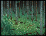 This is a very hard 689 piece wooden jigsaw puzzle of a richly detailed 1928 diptych painting of a forest by Katayama Bokuyo. Our puzzle has mushroomy and leafy connectors and pentagonal pieces. Forest-themed whimsy pieces abound. Puzzle design by Tara Flannery and Jim Muller. This puzzle has a straight edge, but it's very difficult. Like all our puzzles, the pieces are laser-cut from 1/4 inch thick wood.