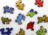 This is a 523 piece wooden jigsaw puzzle of the vivid "Riders on the Storm" by Iwona Lifsches. The puzzle design by David Figueiras has a breezy pattern with a huge variety of whimsical connector shapes (like connectors shaped like mittens, cat heads, apples and more), and lots of themed whimsies.