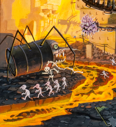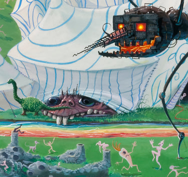 This is an incredible 619 piece wooden jigsaw puzzle of Joe Vaux's 2013 triptych "Garden of Earthly Delights," which re-visits the themes of the original work by Hieronymous Bosch from a contemporary perspective.