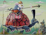 The artist Joe Vaux says about this artwork: This painting was based on my anger at the entire human race for its poor treatment of the other inhabitants of this world. The painting takes place in an alternate time or reality where man is treated the way animals are hunted in our reality. The two hunters, the turtle and hare, the most innocent creatures I could think of, are returning from their regal hunt.