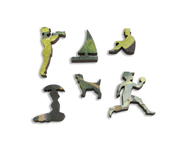 This is a 428 piece wooden jigsaw puzzle of Georges Seurat's most famous painting, "A Sunday Afternoon on the Island of La Grande Jatte." The puzzle cut echoes the design with a number of themed whimsy pieces and a variety of fancy connectors; puzzle design by Tara Flannery. This puzzle has a straight edge and average difficulty. Like all our puzzles, made with 1/4" thick wood and the pieces are laser-cut. Packaged in our standard pine wood box. Made in USA.