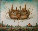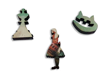 This is a 162 piece wooden jigsaw puzzle of an illustration of the Cheshire Cat from Alice In Wonderland by Russian neosurrealist Sergey Tyukanov. Puzzle design by Maria Berg includes a number of Alice-in-Wonderland themed whimsy pieces. This puzzle has a straight edge and is of about average difficulty. Like all our puzzles, laser-cut from 1/4" thick wood. Packaged in a small, elegant cardboard box with a magnetic clasp. Made in USA.