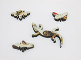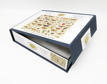 This is a 161 piece wooden jigsaw puzzle of "Butterflies" by Flemish painter Jan van Kessel the Elder. This puzzle, designed by British artist Matt Lyon, features a bursting cocoon of themed whimsies. It has a straight edge, but its non-unique connectors make it a tricky challenge (difficulty: really hard). Packaged in a small blue box with magnetic clasp.