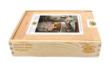 Like all our puzzles, made with 1/4" thick wood and the pieces are laser-cut. Packaged in an unfinished pine wood box with picture on top and sliding lid.