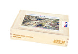 Packaged in a pine wood box with sliding lid and with a small image of the puzzle on top, and engraved side label.